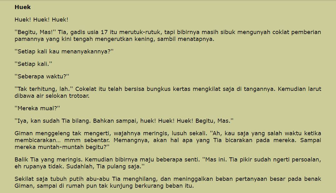 Monas Junior adalah nama pena dari Alpadli Monas. Cerpen Huek ini tayang di Angsoduo.net pada Oktober 2005.