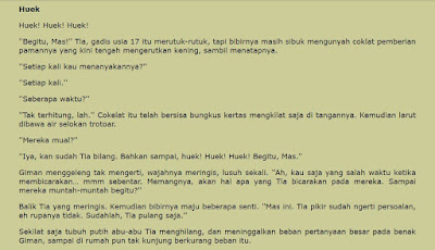 “Begitu, Mas!” Tia, gadis usia 17 itu merutuk-rutuk, tapi bibirnya masih sibuk mengunyah coklat pemberian pamannya yang kini tengah mengerutkan kening, sambil menatapnya.
